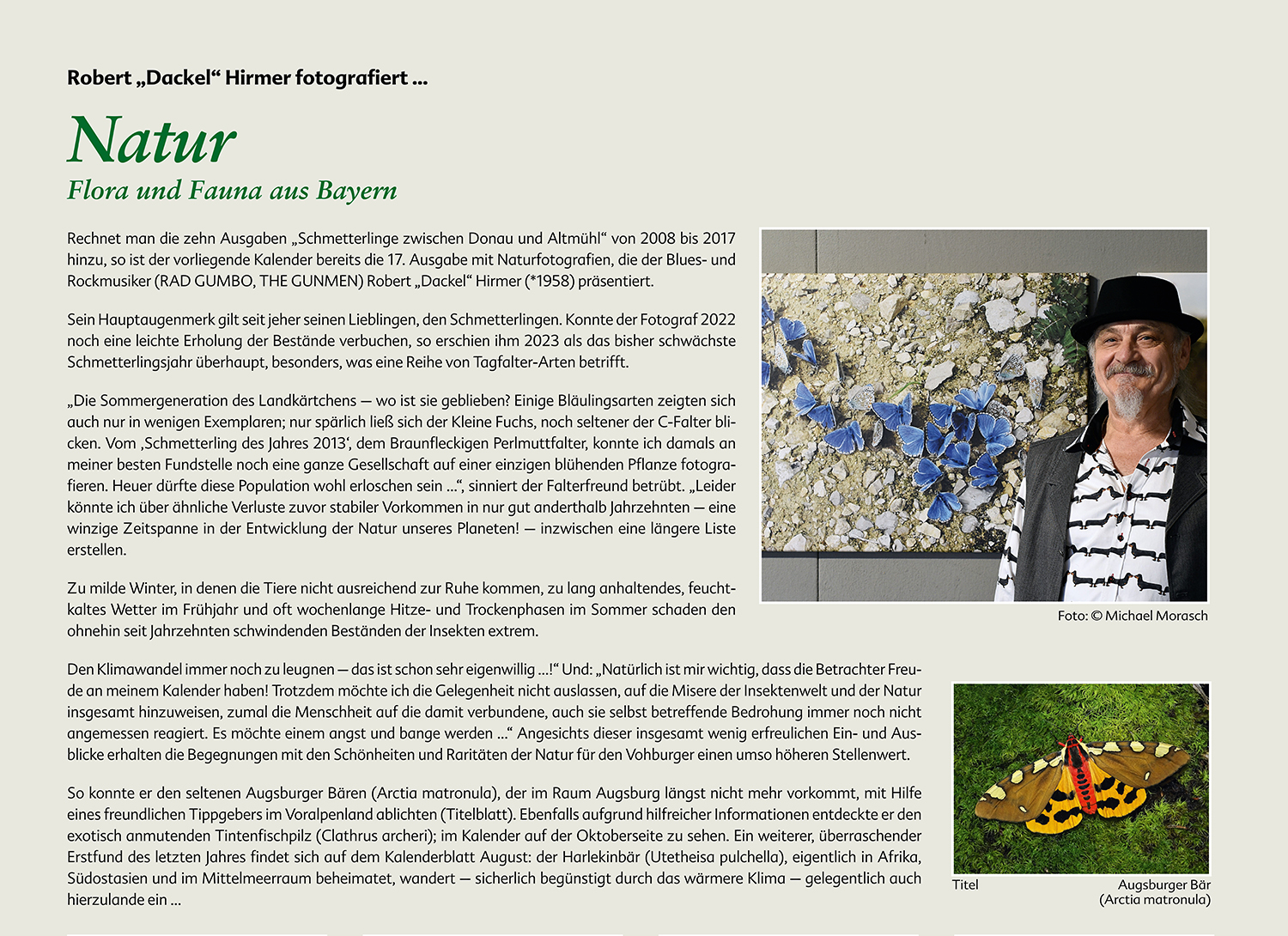 Robert „Dackel“ Hirmer ist daher für viele Fotografien auf Hinweisgeber angewiesen – er packt dann seine Fotoausrüstung und fährt dorthin, wo eine bestimmte Art noch zu finden ist. So ist auch das Titelbild 2024 entstanden: Es zeigt den seltenen Falter „Augsburger Bär“ – der aber kommt im Augsburger Raum längst nicht mehr vor. Hirmer hat ihn Dank hilfreicher Tipps schließlich im Voralpenland gefunden und abgelichtet.